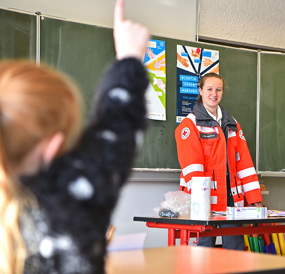Die notwendigen Materialien werden vom DRK Kreisverband zur Verfügung gestellt. Vermutlich das Wichtigste hierbei: Einmalhandschuhe und Dispersionsfarbe. Mit der roten, gelben oder grünen Farbe lässt sich sehr anschaulich demonstrieren, wie und wo die Seife beim Händewaschen verteilt werden muss. Während die ausgebildeten Jugendrotkreuz- und Bereitschaftsmitglieder vorne die richtigen Bewegungen zeigen, dürfen die Kinder alle mitmachen – zum Leidwesen vieler jedoch nur als „Trockenübung“ ohne Farbe. Neben der richtigen Handhabung von Mund-Nasen-Schutz und „Alltagsmasken“ beim Auf- und Absetzen sowie der Aufbewahrung in Dosen oder Tüten werden auch Informationen zum Corona-Virus in Leichter Sprache vermittelt. In einer Fragerunde mit den Schülern wird auf die geltenden Hygieneregeln und deren Umsetzung nochmals eingegangen und die Wichtigkeit der Einhaltung – auch im Alltag – betont. Dass die Unterweisung bei den Kindern und Jugendlichen ankommt, zeigt sich direkt am Ende der Veranstaltung: um den nötigen Abstand zu wahren, verlassen die Schüler einzeln das Klassenzimmer und warten im Gang bis sich eine genügend große Lücke auftut um problemlos zum Treppenhaus zu kommen.