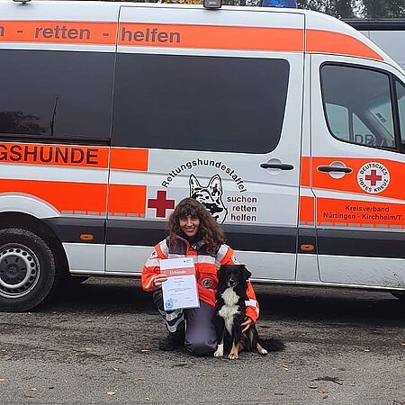 Wir freuen uns sehr über Verstärkung bei unseren Flächensuchhunden! Heute haben Gunita und ihre Hündin Amy die Prüfung in Verweis, Unterordnung und Suche erfolgreich bestanden! Innerhalb von zwanzig Minuten galt es, zwei vermisste Personen im Wald aufzuspüren und korrekt anzuzeigen. Der Fleiß im Training machte sich bezahlt - Amy darf nun die Plakette des DRK am Halsband tragen und mit in den realen Einsatz!