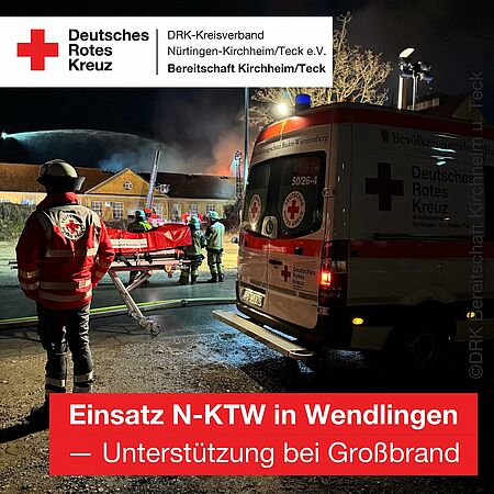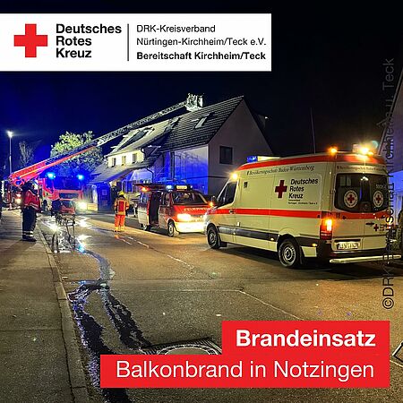 Am späten Donnerstagabend wurde die DRK-Bereitschaft Kirchheim zu einem Brandeinsatz nach Notzingen alarmiert. An der Einsatzstelle übernahmen wir - zunächst zusammen mit der RTW-Besatzung - die sanitätsdienstliche Absicherung der Feuerwehr Notzingen und der Feuerwehr Kirchheim/Teck. Der RTW konnte gegen 22:50 Uhr aus dem Einsatz entlassen werden. Wir verblieben mit dem N-KTW, zwei Rettungssanitätern und einem Rettungsassistenten vor Ort. Um 00:45 Uhr beendeten wir den Einsatz ohne weitere Tätigkeiten. (FP)