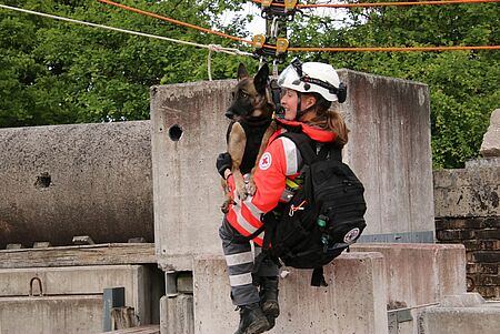 Die jungen Hunde durften sich zuerst an das Anziehen und Tragen des Geschirrs gewöhnen. Wir starteten mit leichten Übungen, wie dem Hochziehen des Hundes an einem Seil, das Abseilen von einer drei Meter hohen Wand und das Abseilen in einen 2 Meter tiefen Schacht.
