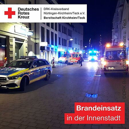 Am Freitagabend wurden wir zusammen mit der Feuerwehr, dem Regelrettungsdienst und der Polizei zu einem „Brand 3“ in die Kirchheimer Innenstadt alarmiert.