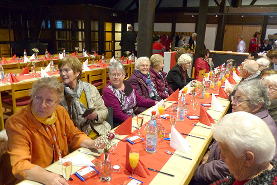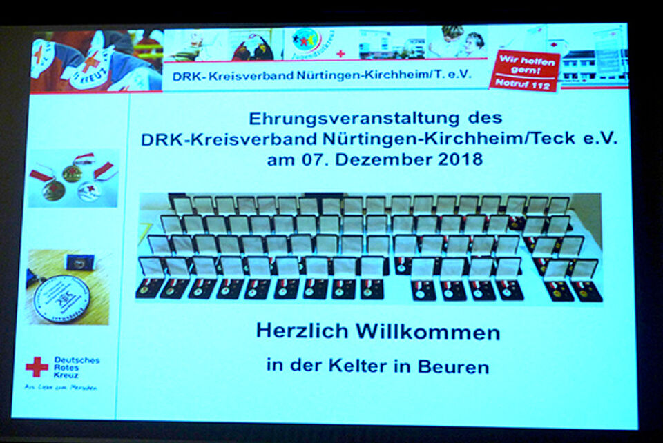(08.12.2018/Roland Rath) Schon beim Betreten der festlich eingedeckten Kelter in Beuren am 07.12.2018 spürte man sofort, dass heute wohl etwas ganz Besonderes und Großes stattfinden wird. Dies, zumal man unter den Gästen und Gela-denen unter anderem auch Wilfried Klenk, Staatssekretär im Ministerium für Inneres, Digitalisierung und Migration Baden-Württemberg und Dr. Lorenz Menz, Ehrenpräsident des DRK-Landesverbands Baden-Württemberg, entdecken konnte. Alle waren im „feinem Zwirn“ erschienen. Der Grund hierfür lag sicherlich nicht an der Adventszeit, sondern daran, dass das Land Baden-Württemberg 2 Personen mit einer ganz besondere Ehrung und der Kreisverband Nürtingen-Kirchheim/Teck e.V. vom Deutschen Roten Kreuz an diesem Abend 63 ehrenamtliche Mitglieder mit der DRK-Verdienstmedaille auszeichnete.