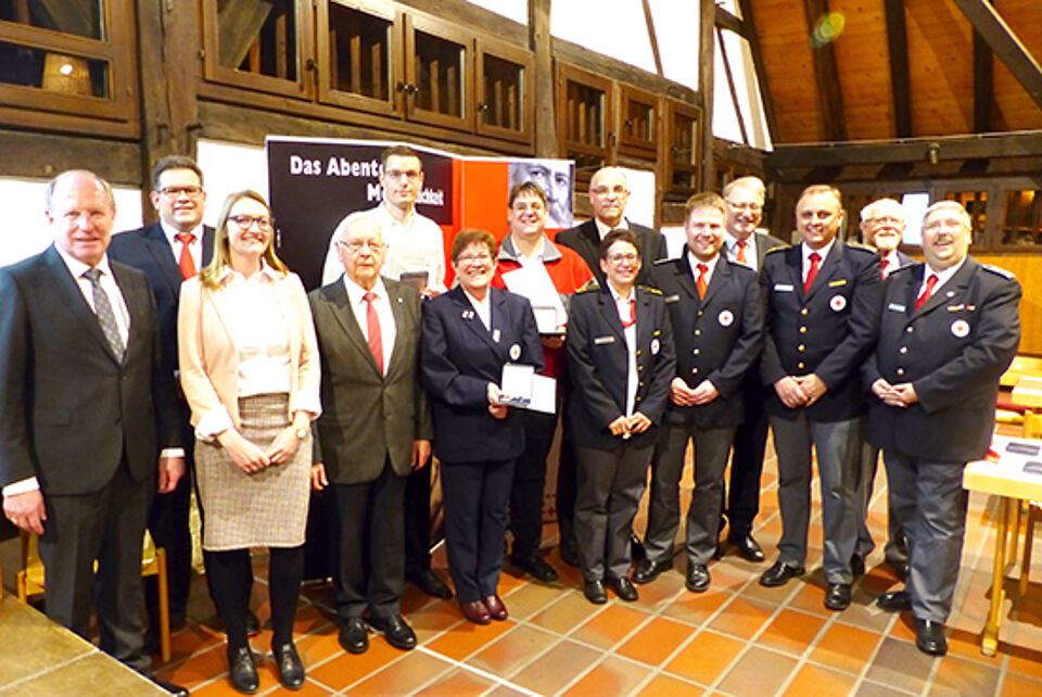 Mit diesem Zitat von Mark Twain und dem Hinweis: dass heute das ehrenamtliche Engagement aller Geehrten „EhrenWert“ ist, eröffnete Klaus Rau, Kreisgeschäftsführer seine Rede und fand in seiner Laudatio für alle Ausgezeichneten die passenden Worte unter Berücksichtigung der, sie prägenden DRK-Stationen. Zur Übergabe der Medaillen und Urkunden durch die Mitglieder des Ehrungsausschusses wurden alle Geehrten auf die Bühne gebeten.