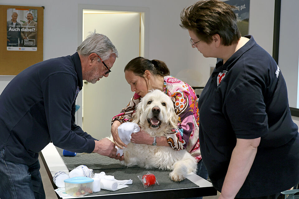 In diesem Jahr sind weitere Erste Hilfe Kurse für Hunde geplant. Ob Einsatzhund oder Familienhund: Der Kurs ist für alle Hundebesitzerinnen und -besitzer geeignet; es werden keine besonderen Vorkenntnisse erwartet. Wichtig zu wissen ist, dass beim Kurs keine eigenen Hunde mitgebracht werden dürfen - das würde zu sehr Unruhe in den Kurs bringen. Alle praktischen Elemente werden am Hund der Kursleitung gezeigt.