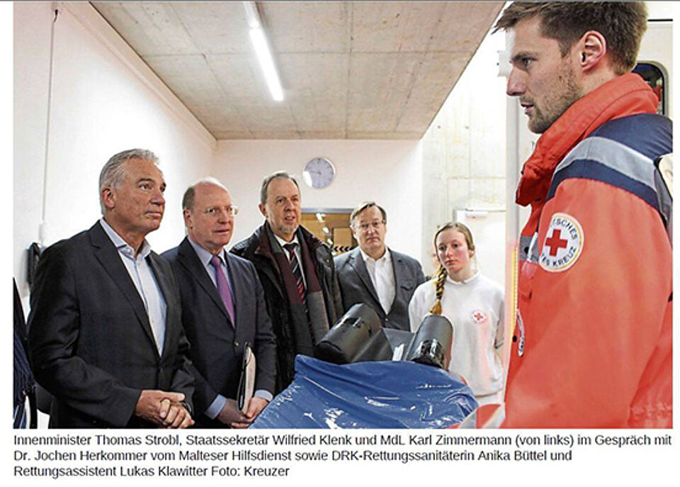 (Roland Rath) Am 09.01.2019 besuchten im Rahmen einer Klausurtagung der CDU-Landtagsfraktion in Nürtingen Innenminister Thomas Strobl, Staatssekretär Wilfried Klenk, MDL Karl Zimmermann und weitere Abgeordnete der Arbeitskreise Recht und Verfassung, Inneres, Digitalisierung und Migration sowie Soziales und Integration die neue Rettungswache der DRK Rettungsdienst Esslingen-Nürtingen gGmbH und den Kreisverband Nürtingen-Kirchheim/Teck e.V. vom Deutschen Roten Kreuz. Mit der Besichtigung der neuen DRK-Rettungswache Nürtingen wollten sich die Politiker einen Blick hinter die Kulissen der täglichen Arbeit unseres Rettungsdienstes verschaffen. In der anschließenden Diskussion in der DRK-Kreisgeschäftsstelle Nürtingen kamen die anwesenden Vertreter der Rettungsdienstorganisationen, Feuerwehr, THW und DLRG im Kreis Esslingen zu Wort und trugen in einer regen Diskussion ihre aktuellen Probleme und Wünsche den politischen Entscheidungsträgern vor.